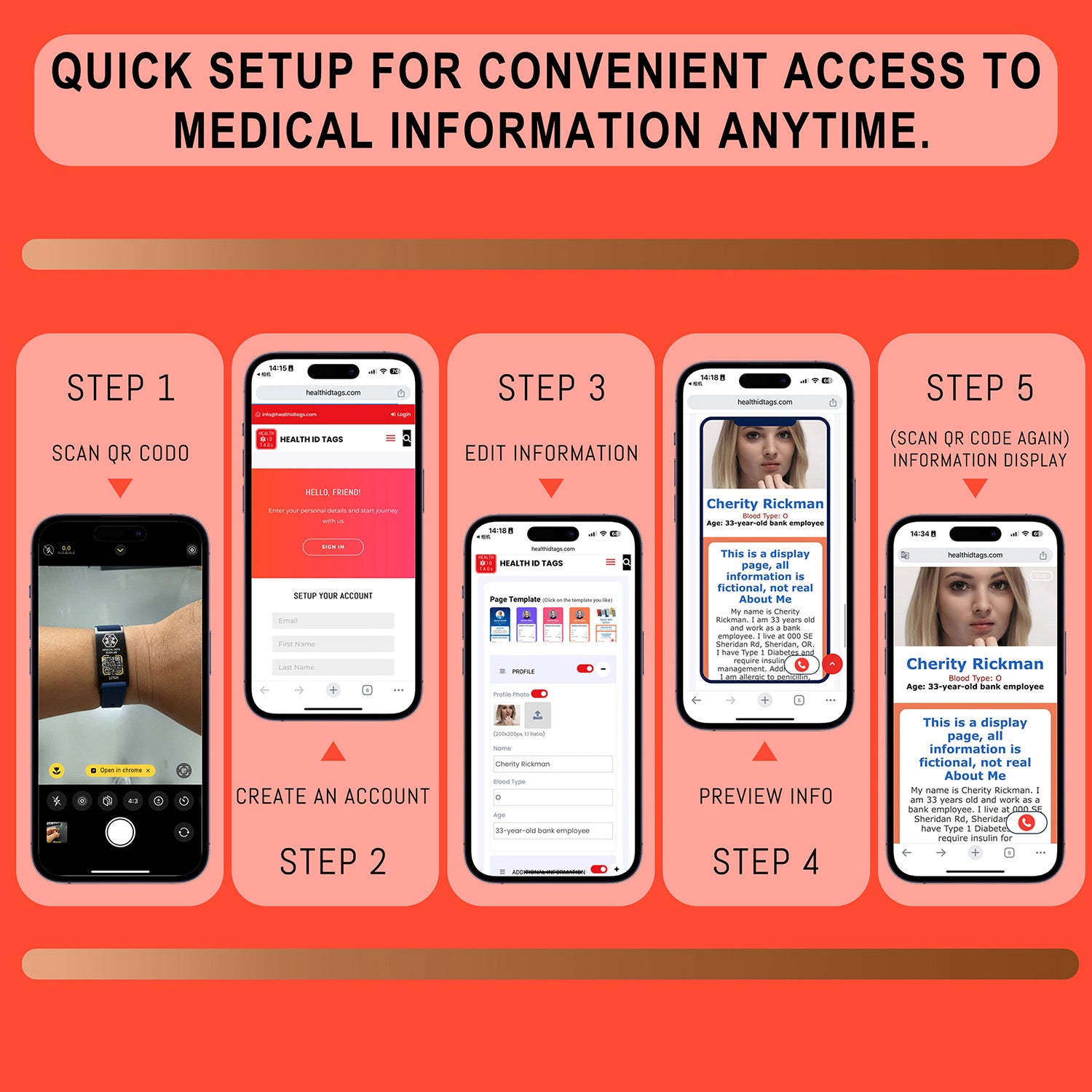 Effortless Setup and Use: Activating your bracelet is straightforward—simply scan the QR code to create an account. You can then enter or update your information, upload photos, and adjust settings without requiring an app or incurring subscription fees.