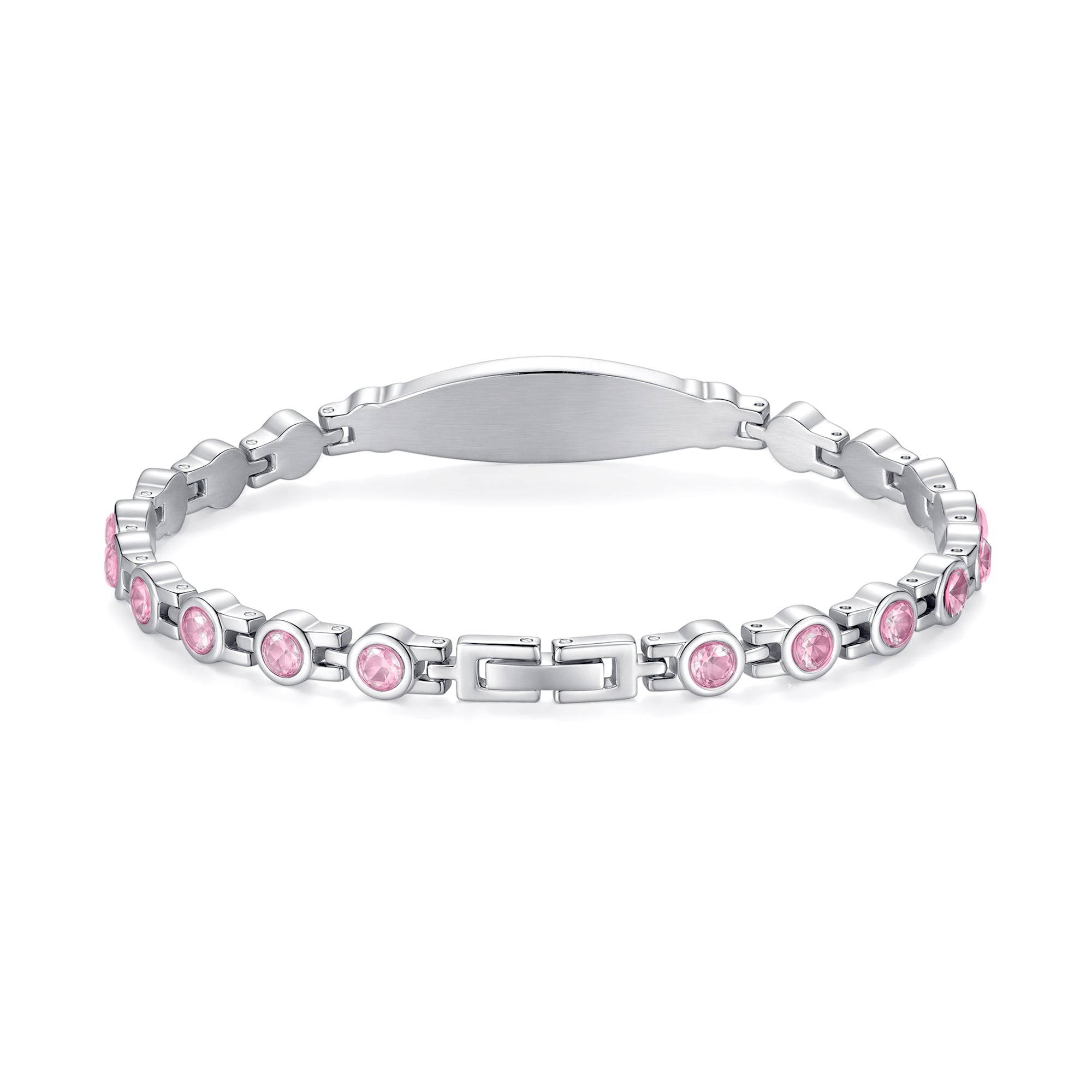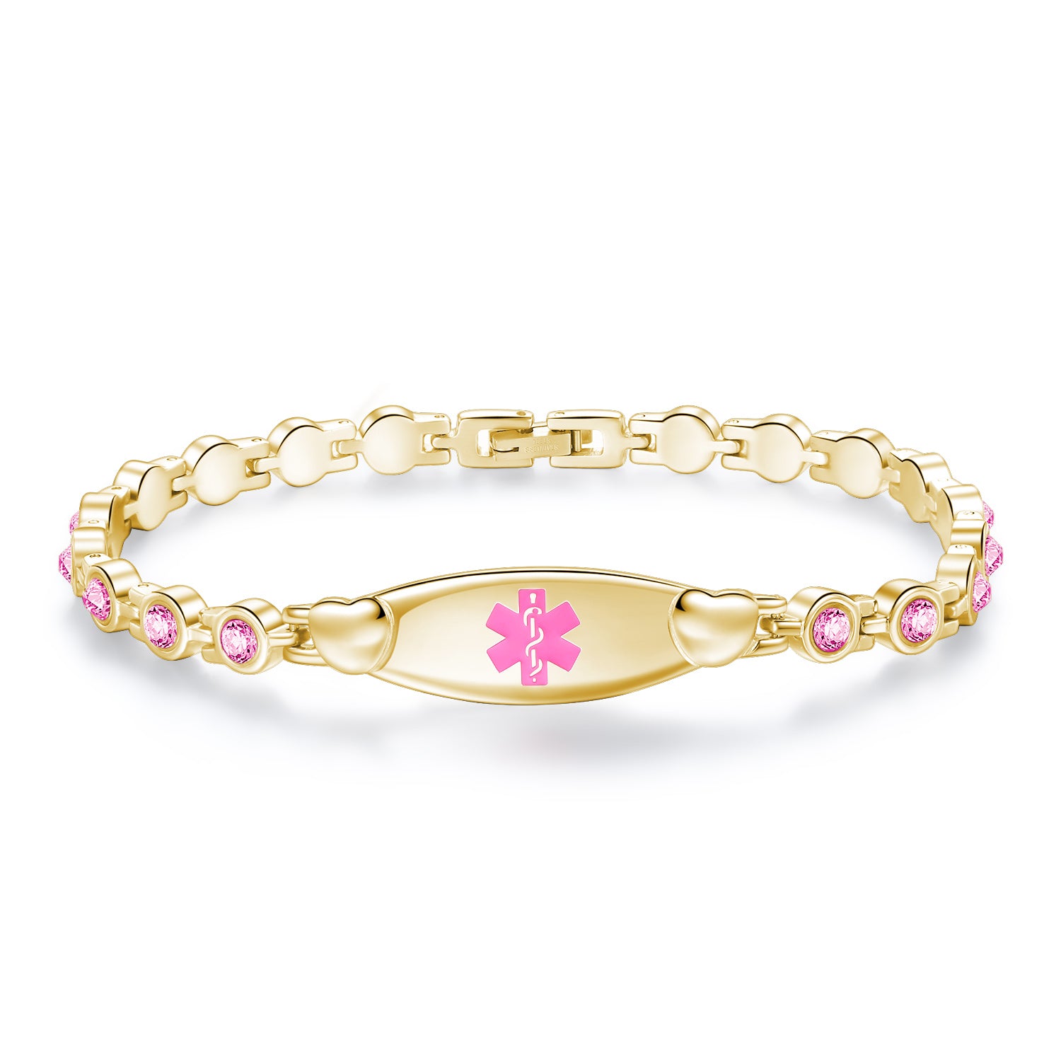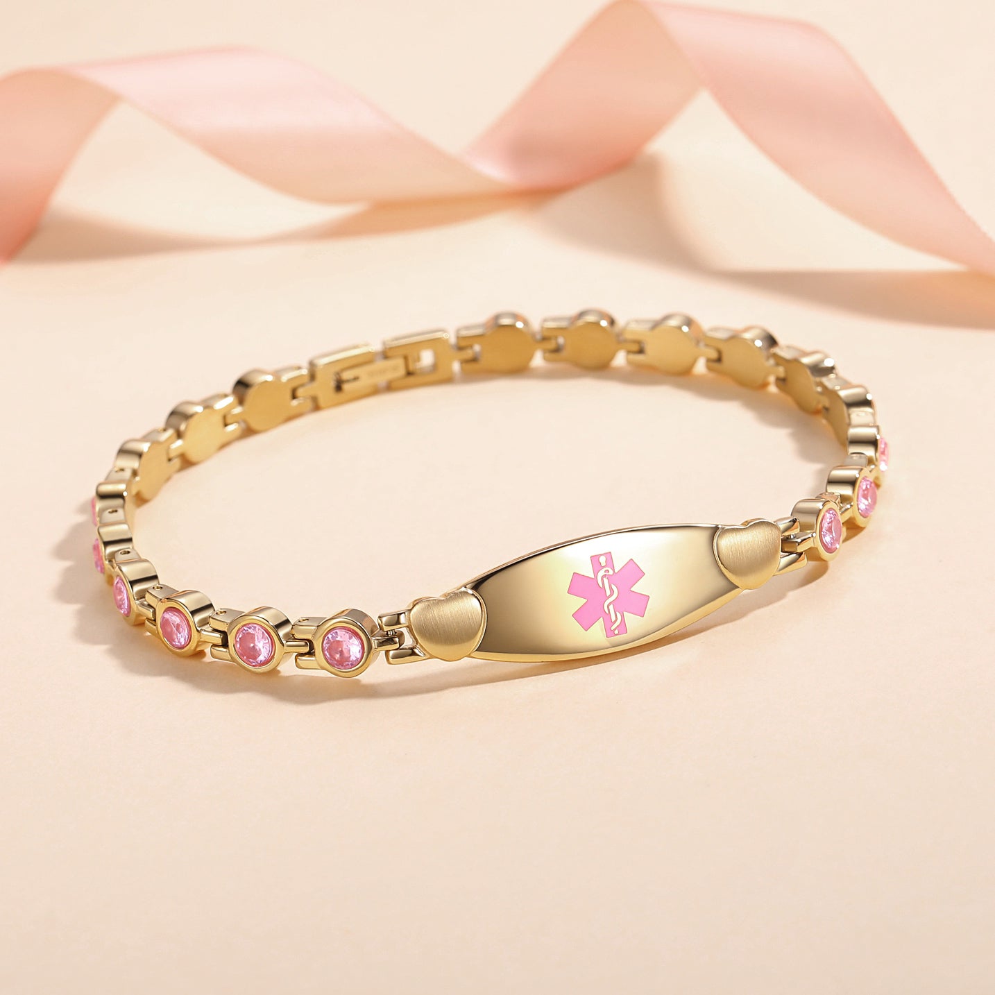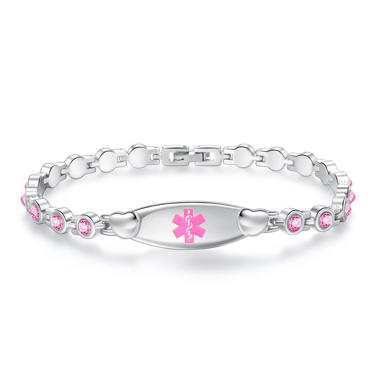 MD1447 Heart Medical ID & Crystal Stone Stainless Steel Link Bracelet ~ Custom Engrave
