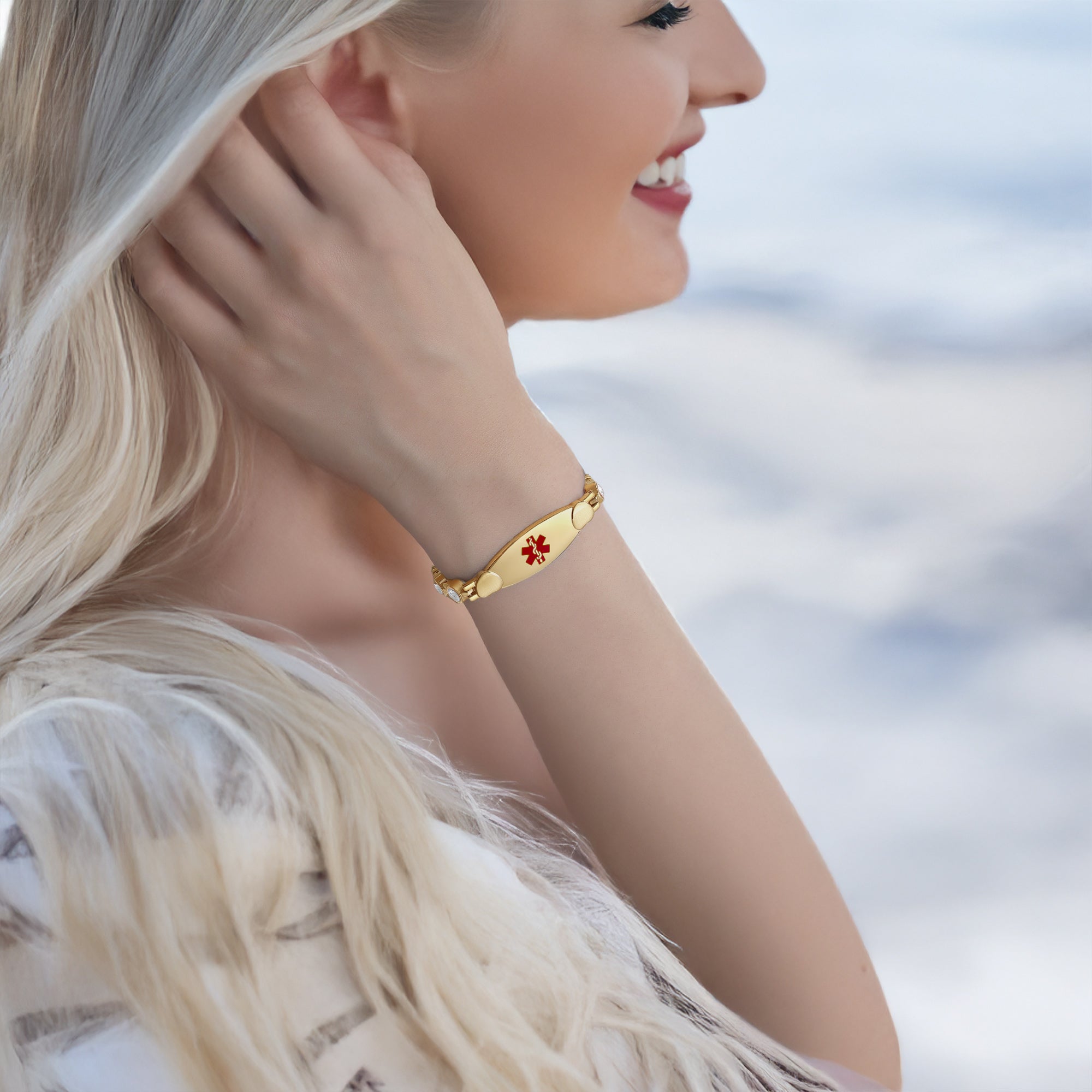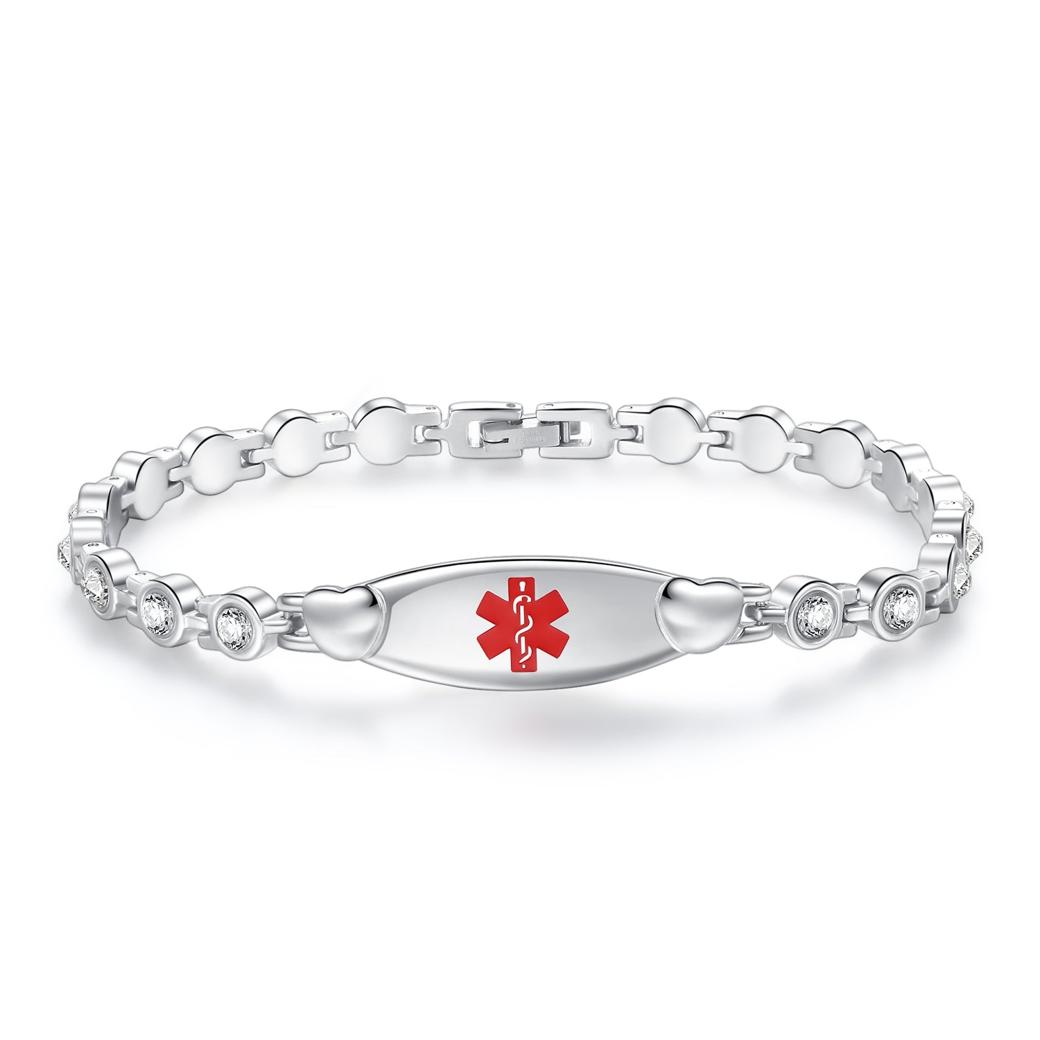 This heart-shaped medical ID bracelet set combines elegance and practicality, crafted from polished stainless steel with a shimmering crystal stone centerpiece on the band. This bracelet features a delicate and refined appearance with sizes ranging from 6.5 to 8.5 inches, customizable and adjustable for a perfect fit.