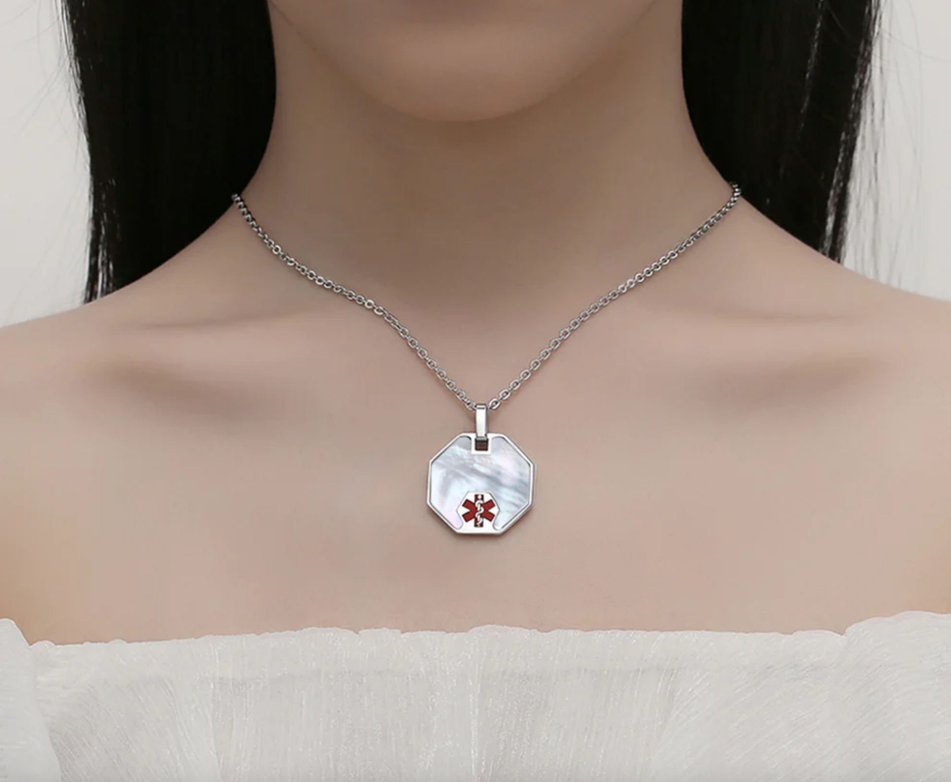 This stainless steel Octagon shaped medical identification necklace is designed to meet the personalized needs of different women. Beautiful Mother of Pearl heart medical id necklace in stainless silver. This Necklace features a Medical surgical grade 316L stainless steel. It is shiny polished will not rust, no allergies, and is waterproof.