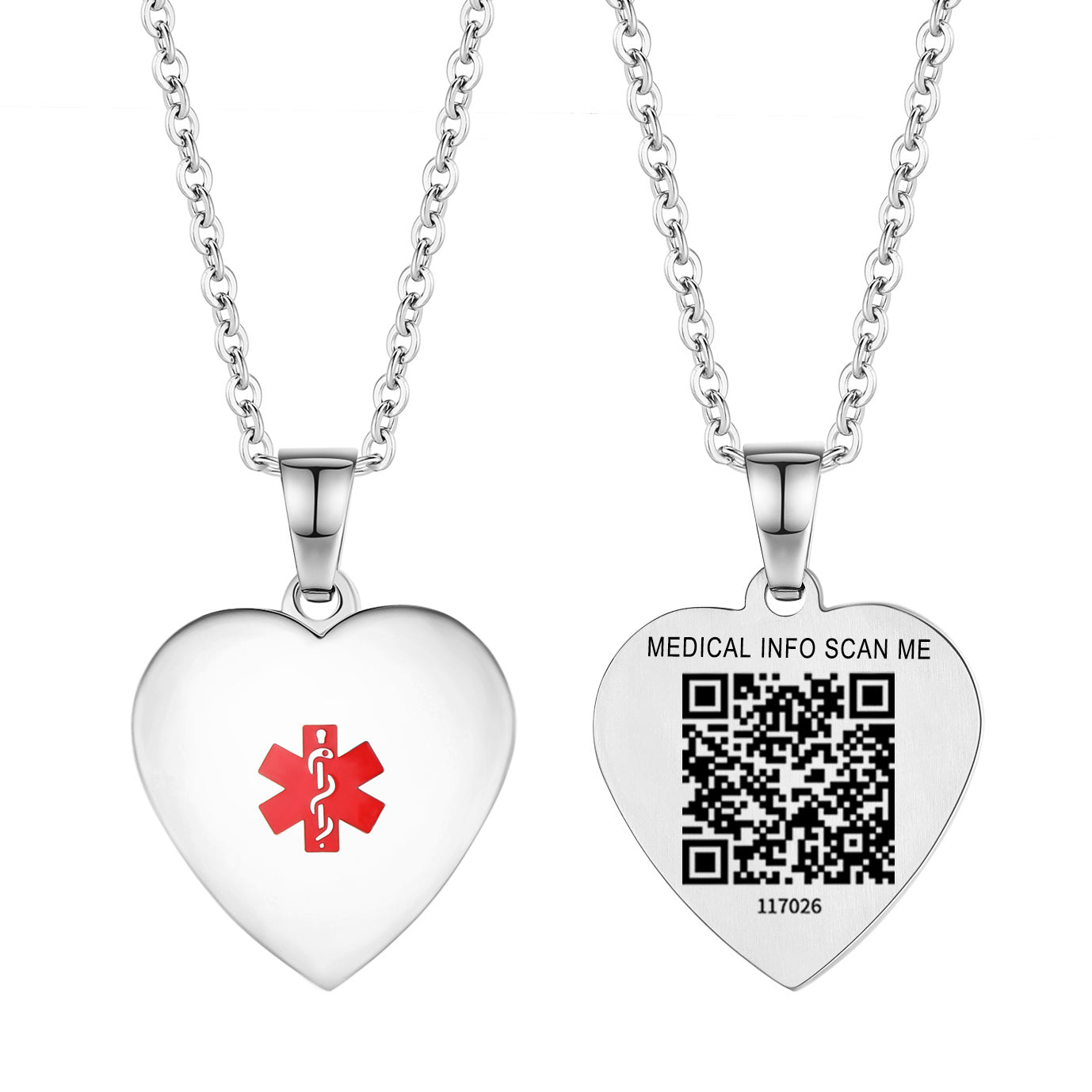 This stainless steel Heart medical identification necklace is designed to meet the personalized needs of different women. The back of the necklace is engraved with a QR code. After scanning it, you can access your personal medical information immediately without installing any applications, ensuring the security and convenience of the information. Equipped with a 21-inch main chain and a 3-inch extension chain, it is suitable for different wearing habits. The material is sturdy and durable, making it an ideal choice for daily wear and medical emergencies. QR features include: