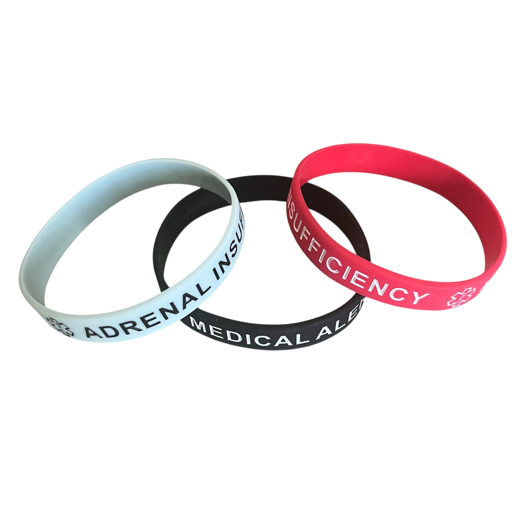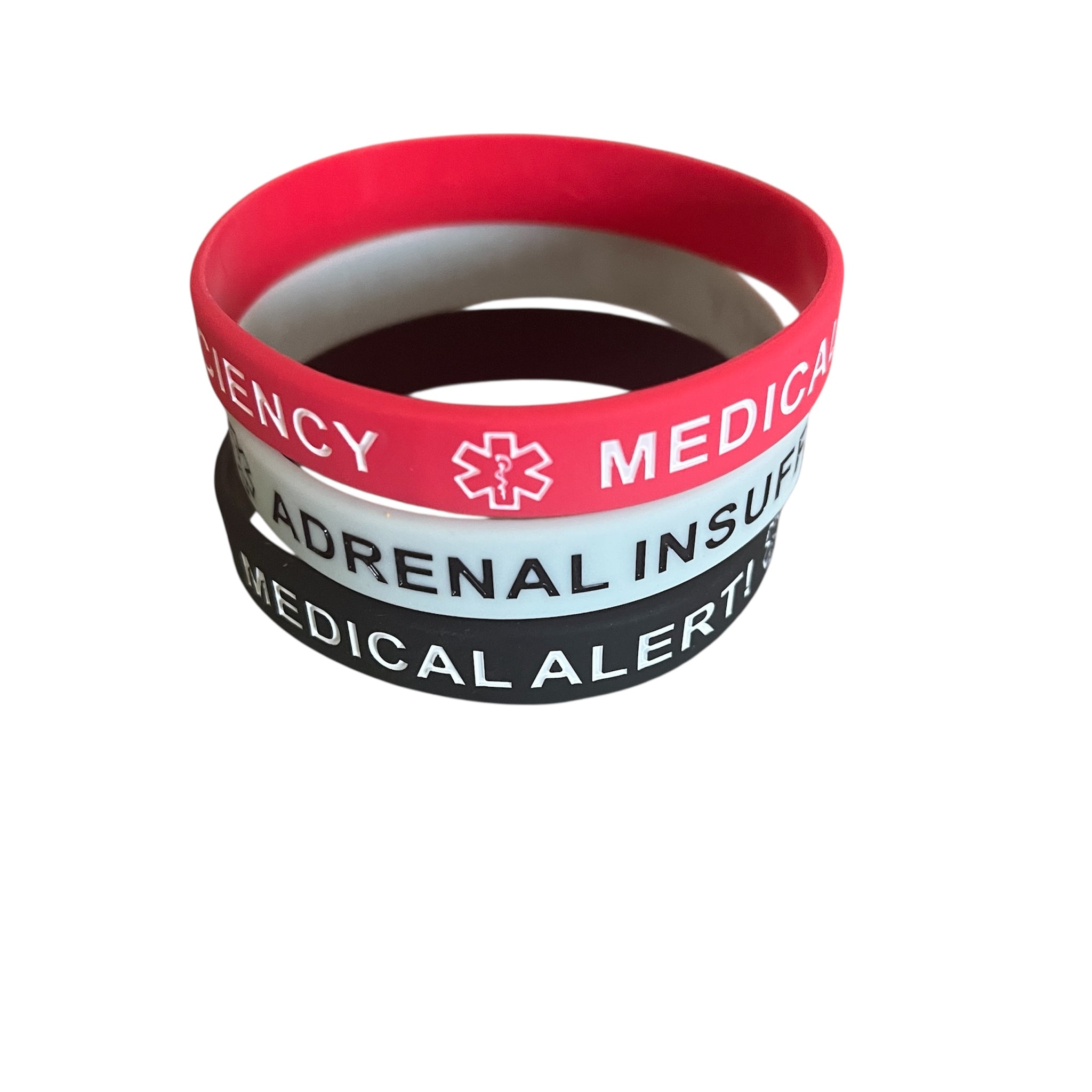 Set of 3, standard adult size 8" silicone bracelets. All 3 state MEDICAL ALERT! ADRENAL INSUFFICIENCY on each bracelet separated with 2 medical symbols. Includes 1 Red, 1 Black, and 1 grey/blue. Bracelets are 100% silicone rubber, hygienic, and will not create any allergic issues.